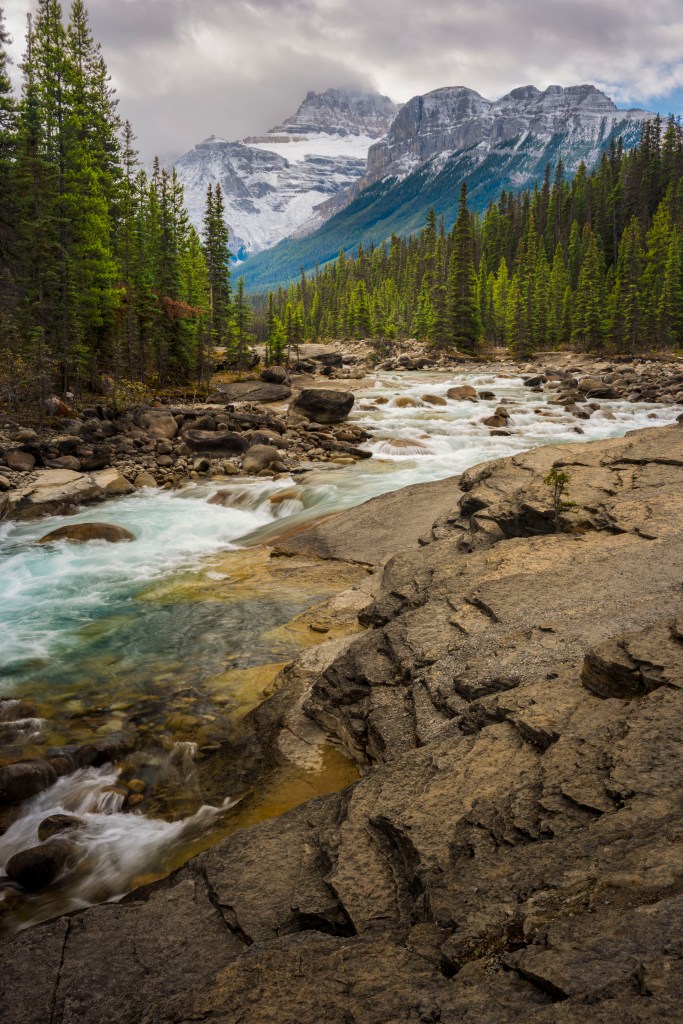 The parking area and trail head are located about 50 minutes (74 km) from Lake Louise. The trail itself is rough gravel. After about 500 downhill meters from the parking lot, you will cross a bridge over the Mistaya River. Take some time to appreciate the erosion through the solid rock. Carving the canyon with water power alone. From the bridge it is a short walk to various view points along the river. There are incredible river views of the river with Mount Sarbach dominating the background. To extend your hike, take the 1km loop. It starts from the river crossing and follows a gentle path up the valley wall.