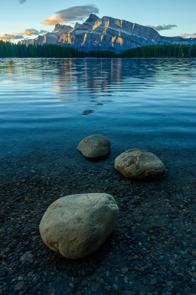 The lake offers varied and interesting foregrounds, reflections when conditions cooperate, and a sense of scale that does justice to the mountain. Sunrise is the optimal time to shoot here, as the rising sun gradually illuminates the face of Rundle and brings depth and texture to the rock. Check out my post about my five favorite Canmore locations here.