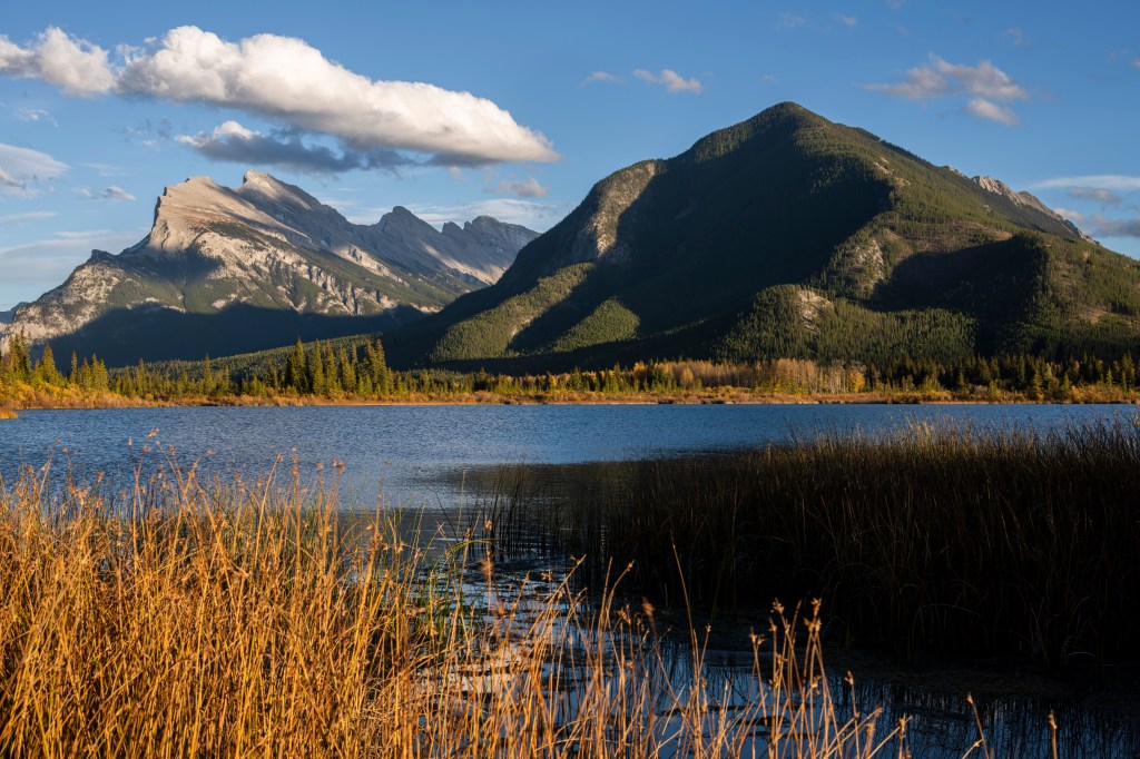 Vermillion Lakes—a chain of three lakes just west of Banff along the south side of Highway 1—may be the most compositionally diverse location for photographing Mount Rundle. Each lake offers a different perspective, with foreground elements ranging from grasses and still water to mist and ice.