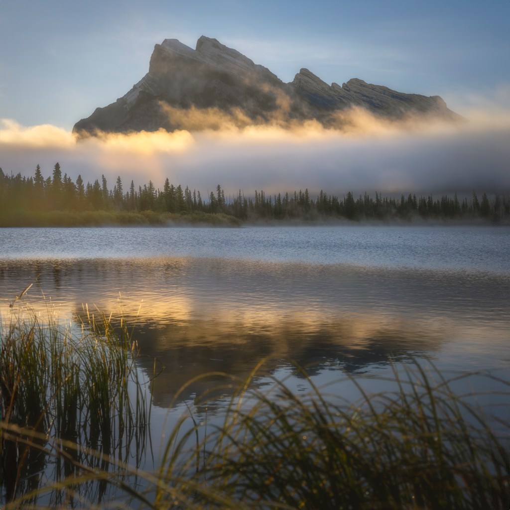 This area shines under a wide range of conditions. Late June sunrises can be dramatic, though cloud cover may limit contrast. Alternatively late September often delivers exceptional light, especially when fog settles over the lakes and slowly lifts as the sun rises. During fall, the angle of the sun creates striking illumination patterns on Rundle’s visible faces.