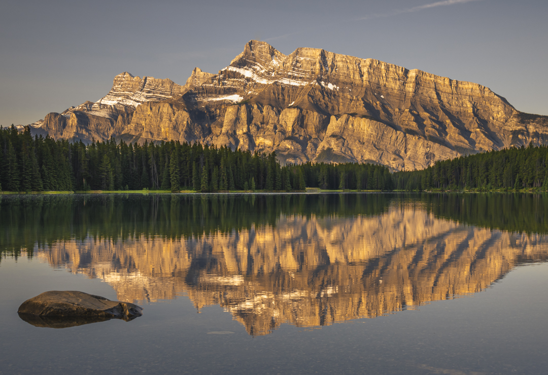 The lake offers varied and interesting foregrounds, reflections when conditions cooperate, and a sense of scale that does justice to the mountain. Sunrise is the optimal time to shoot here, as the rising sun gradually illuminates the face of Rundle and brings depth and texture to the rock. Check out my post about my five favorite Canmore locations here.